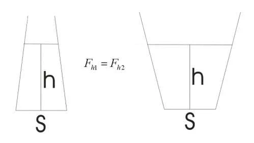 Если стенки сосуда вертикальные, то силы давления жидкости на его стенки направлены горизонтально и не имеют вертикальной составляющей. Сила давления жидкости на дно сосуда в этом случае равна весу жидкости в сосуде. Если же сосуд имеет наклонные стенки, давление жидкости на них имеет вертикальную составляющую. В расширяющемся кверху сосуде она направлена вниз, в сужающемся кверху сосуде она направлена вверх. Вес жидкости в сосуде равен сумме вертикальных составляющих давления жидкости по всей внутренней площади сосуда, поэтому он и отличается от давления на дно[2].
