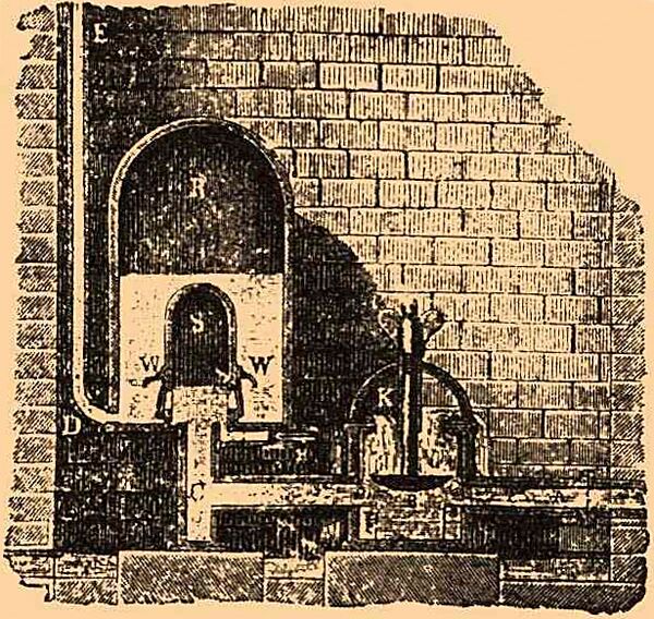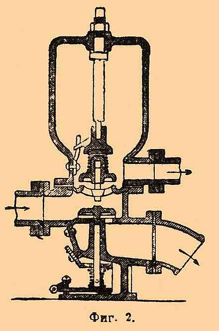 С того момента, как вода, наполняющая , получила возможность течь, работа силы тяжести пойдет на увеличение её скорости до некоторой наибольшей величины, обусловленной высотой уровня воды в пруде над отверстием , размерами и свойством (см. ниже) трубы . Вместе с тем будет возрастать и гидравлическое давление воды на нижнюю поверхность клапана , вес которого так подобран, чтобы он поднялся и закрыл выходное отверстие, как только скорость воды в трубе достигнет своей наибольшей величины. В этот момент гидростатическое давление воды на внутреннюю поверхность трубы и её продолжения станет возрастать, так как движение воды будет замедляться, пока весь запас работы, заключенный в её массе в виде живой силы, не истратится на растяжение этих стенок, на сжатие самой воды и на внутреннее трение. Но часть этих стенок сделана подвижною: в колоколообразном придатке замкнуто водой некоторое количество воздуха и помещены клапаны , открывающиеся в колокол , тоже содержащий воздух над водой и снабженный подъемной трубой . Поэтому после закрытия клапана живая сила воды начинает сжимать воздух в , пока не поднимутся клапаны ; тогда вода станет входить в , частью сжимать находящийся в нём воздух, а частью подниматься по трубе на высоту . На все это скоро истратится вся живая сила воды, давление в перевесит давление в , клапаны закроются, откроется, и весь процесс начнется снова. Возрастание давления будет тем больше, чем быстрее захлопывается клапан и чем неподатливее стенки сосуда, заключающего воду в движении. Такого «гидравлического удара» тщательно стараются избегать при устройстве водопроводов, чтобы не лопались трубы, поэтому Монгольфье и устроил колпак ; упругая податливость воздуха, в нём заключенного, ослабляет силу удара; воздух же в колпаке служит регулятором для трубы и поддерживает в ней движение воды в тот период, когда клапаны W закрыты. При повышенном давлении в воде растворяется больше воздуха, чем при атмосферном давлении, поэтому количество воздуха в и уменьшалось бы во время непрерывной работы. Чтобы пополнять эту убыль, служит клапан , отворяющийся внутрь: как только клапаны захлопнутся, упругость воздуха в заставит воду в отхлынуть назад; с приобретенною скоростью она перейдет своё положение равновесия и произведет на очень короткое время под давление, меньшее атмосферного. В этот момент через входит немного воздуха.