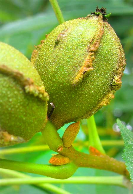 Плод — ложная костянка, круглая, продолговатая или обратнояйцевидная (грушевидная), одетая мясисто-кожистым, затем древеснеющим наружным слоем, растрескивающимся при созревании на четыре створки; орех с костянистой оболочкой, гладкой, слегка морщинистой или ребристой, четырёхгнёздный при основании и двухгнёздный на верхушке. В отличие от грецкого ореха плод снаружи гладкий, в то время как у грецкого ореха нерегулярнобороздчатый. Семя 2—4-лопастное. Начинает плодоносить с 10—12 лет и продолжает до старости, семенные годы бывают через год.