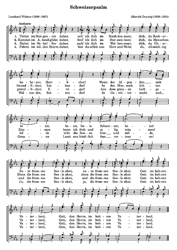 История гимна начинается в 1841, когда Альберих Цвиссиг (нем. Alberich Zwyssig, 1808—1854), священник и композитор из Ури, получил письмо от Леонарда Видмера (нем. Leonhard Widmer, 1809—1867), музыканта, журналиста и поэта из Цюриха. В письмо был вложен текст патриотической поэмы, написанной Видмером, которую он хотел положить на музыку. Для нового текста Цвиссиг решил приспособить музыку написанного им в 1835 латинского церковного гимна «Diligam te Domine». 22 ноября 1841 года новая песня (получившая позднее название «Швейцарский псалом») впервые была исполнена перед жителями Цуга.