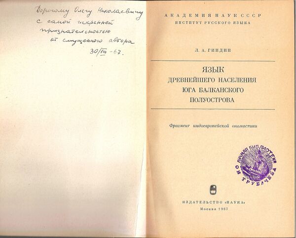 - «Язык древнейшего населения юга Балканского полуострова» (М. 1967)