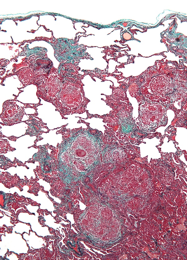 Биопсия легкого позволяет уточнить диагноз в неясных случаях. Сначала проводят трансбронхиальную биопсию. Если она недостаточно информативна и диагноз остается неясным, показана открытая биопсия легкого. Гистологическая картина экзогенного аллергического альвеолита весьма характерна, хотя не патогномонична. Если биопсия проведена при острой форме заболевания, типичны интерстициальная и альвеолярная инфильтрация из плазматических клеток, лимфоцитов, эозинофилов и нейтрофилов, иногда в сочетании с гранулемами. Васкулит при экзогенном аллергическом альвеолите не развивается[8].