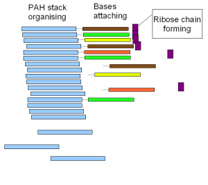 Последующее кратковременное повышение кислотности окружающей среды, например, в результате вулканических извержений, освободивших кислотные газы (диоксид серы, углекислый газ), возможно, вызвало отсоединение азотистых оснований от ПАУ-остова, формируя РНК-подобные молекулы (с формальдегидным остовом вместо сахарофосфатного, используемого современными РНК, но с тем же шагом 0,34 нм)[1].