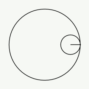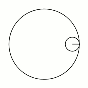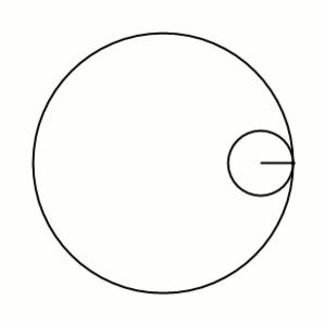 Вывод уравнений Пусть в начальный момент окружности касаются в точке , лежащей на оси , где точка — центр большой окружности. Координаты точки при этом - , где . Рассмотрим, как меняются координаты точки , привязанной к катящейся окружности ( переходит в ). Пусть маленькая окружность прокатилась так, что её центр перешел из точки в точку и повернулся относительно точки на угол . Во-первых, можно показать, что поворот маленькой окружности относительно своего центра при этом (т.е. угол между и ) равен . Во-вторых, координаты точки будут такими: . Тогда, зная, куда перейдет центр катящейся окружности, и на какой угол она повернулась относительно этого центра, можно записать координаты точки : |