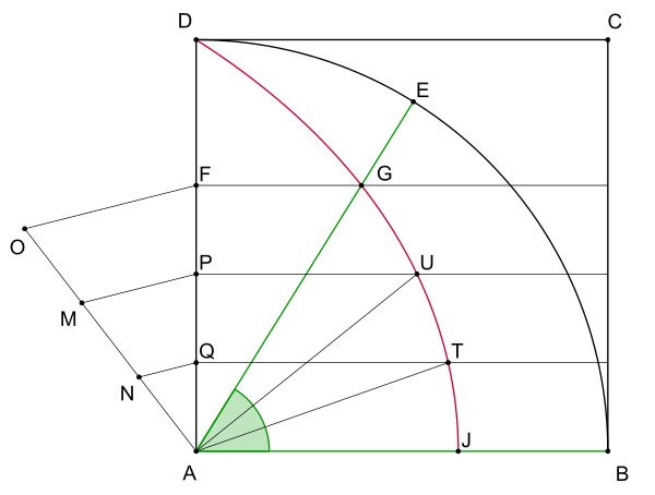 Квадратриса получается следующим образом. Рассмотрим квадрат , в котором концы отрезка равномерно движутся по прямым и , а отрезок (также равномерно) вращается вокруг точки , причём оба отрезка придут в положение одновременно. В каждый конкретный момент времени обе линии будут пересекаться в точке . Кривая, состоящая из всех точек таких пересечений, и есть квадратриса. Чтобы разделить некий угол, к примеру, на правом рисунке, в произвольно заданном отношении, следует отметить на квадратисе точку пересечения . Далее, через эту точку проводим параллельную прямую. Чтобы совершить трисекцию угла, отмечаем на прямой точки и таким образом, чтобы выполнялось равенство . Из этих точек проводим параллельные прямые. Соединив точку с точками их пересечения с квадратисой и , мы решим задачу трисекции угла[19].