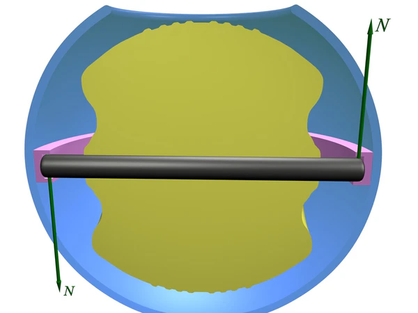 - Ограничительное кольцо — удерживает ось ротора строго в одной плоскости, не давая ей во время кручения «врезаться» в круговую канавку. Это кольцо вращается вместе с ротором по круговой канавке.