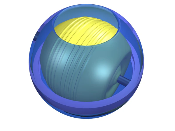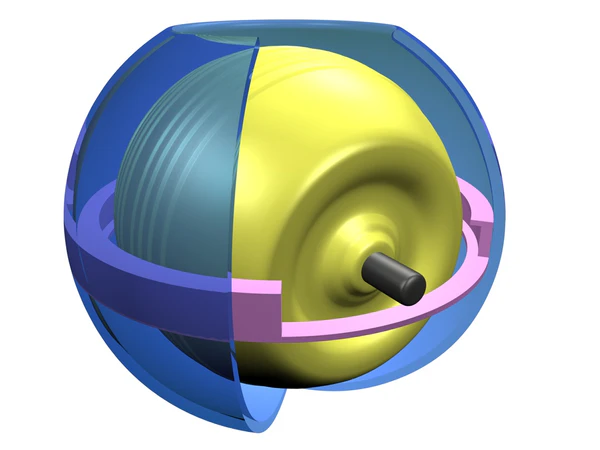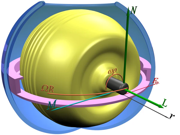 На рисунке 1 показан вид компьютерной модели гиротренажёра. На примере этой модели построены все последующие рисунки, поясняющие устройство и его механику. На рисунке 2 показаны детали внутреннего строения гиротренажёра. Основные его составляющие это корпус, круговая канавка, по которой скользит ось гироскопа, ротор наглухо насаженный на ось, представляющую собой цилиндр длины и диаметра . Круговая канавка жёстко соединена с корпусом гиротренажёра. Ротор представляет собой однородное тело осевой симметрии. На рисунке 2 для большей наглядности часть корпуса «приоткрыта», так чтобы были видны внутренние элементы. Также удалена часть стенки круговой канавки. Ширина паза круговой канавки немного превышает диаметр оси. Ротор гироскопа может приводиться в быстрое вращение вокруг оси, которая может свободно скользить в пазах круговой канавки.