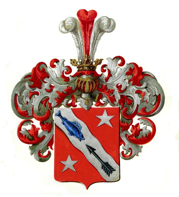 На щите дворянский коронованный шлем. Нашлемник: три страусовых пера, из них среднее червлёное, а боковые серебряные. Намёт червлёный с серебром.