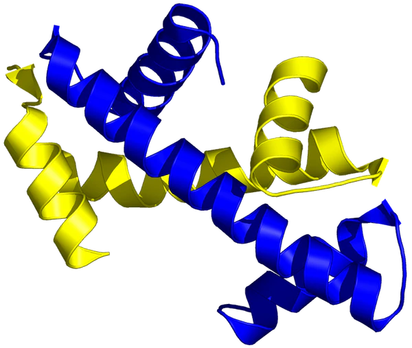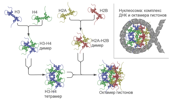Гистоны H3 и H4, Н2А и H2B попарно узнают друг друга. Спиральные домены взаимодействуют между собой, образуя структуры, названные рукопожатием, в результате чего возникают гетеродимеры — Н3-Н4 и Н2А-Н2В. Из первого димера, в свою очередь, образуется тетрамер (Н3-Н4)2. Тетрамер (Н3-Н4)2 и два димера Н2А-Н2В составляют гистоновый октамер, сердцевину нуклеосомы[3]. Нуклеосома имеет клиновидную форму. Её узкую часть составляет (Н3-Н4)2, а широкая часть состоит из двух димеров Н2А-Н2В, которые расположены по бокам тетрамера (Н3-Н4)2 и не взаимодействуют друг с другом. Из всей ДНК, что намотана на нуклеосомный октамер, примерно 80 пар оснований связаны с тетрамером (Н3-Н4)2 и около 40 пар с димерами Н2А-Н2В[10].