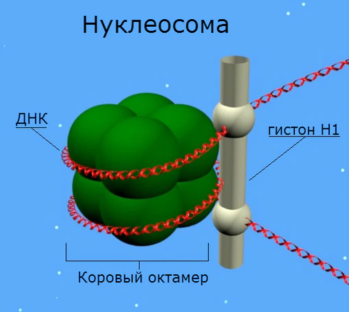 Нуклеосома преставляет из себя примерно 147 пар оснований (п.о.) ДНК, которая намотана вокруг октамера (~1,67 витка спирали), состоящего из пар белков, называемых коровыми гистонами. Диаметр ее составляет 7 нм. Длина фрагмента ДНК, "обхватывающего" одну нуклеосому, варьирует, в среднем составляет 200 п.о. При этом непосредственно с нуклеосомой связаны 146 п.о., а остальные несколько десятков соединяют две соседние нуклеосомы[7]. Линкерный гистон Н1 взаимодействует с линкерным участоком ДНК, при этом не контактируя с гистоновым октамером.