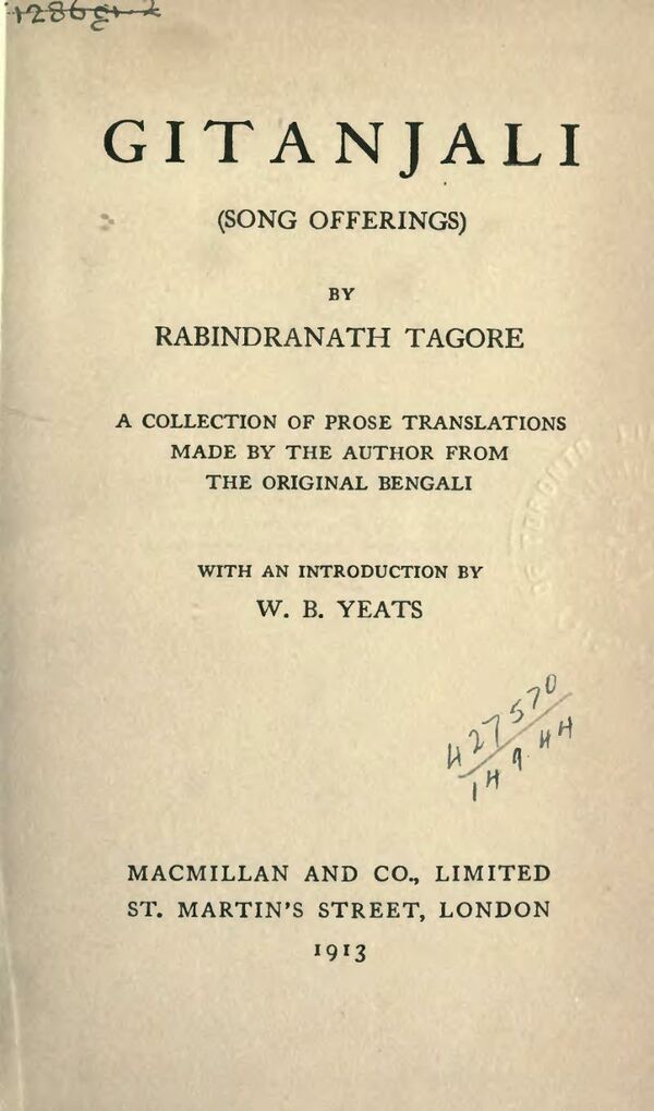 Первое издание увидело свет в Лондоне, в ноябре 1912 года, когда Тагор, по предложению сына Ротхиндроната, поехал в США и находился в Иллинойсе.[9] В целом, оно было воспринято благожелательно, и в следующем году издательство Макмиллан выпустило второе издание «Гитанджали» и переводы некоторых других поэтических сборников и рассказов Тагора.[10]