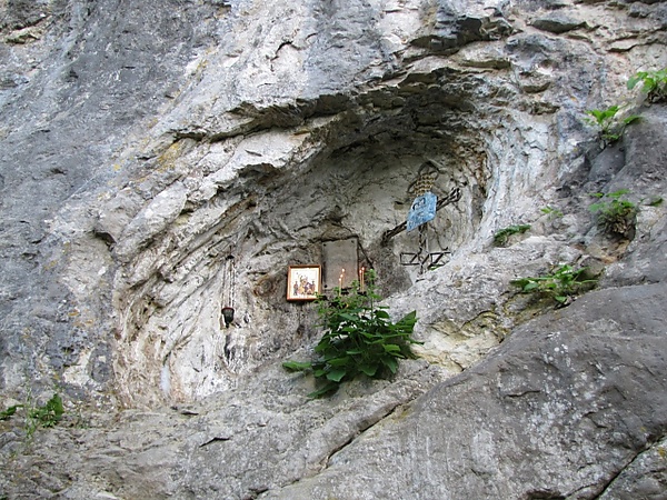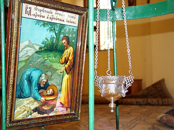 - Место третьего обретения главы представляет собой большую овальную нишу вырубленную в скале в труднодоступном месте. Углубление, в котором долгое время хранилась великая христианская святыня открыто для паломников. Между лампадой и иконой Богородицы — нерукотворный образ главы Иоанна Предтечи.