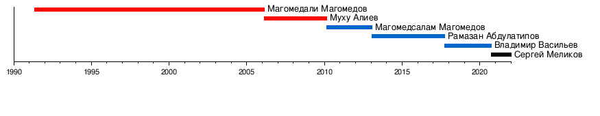 | 3 | Магомедсалам Магомедалиевич Магомедов | 1 | 20 февраля 2010 | (досрочно отстранен от полномочия, указом Президента РФ № 44, 28 января 2013 года) |