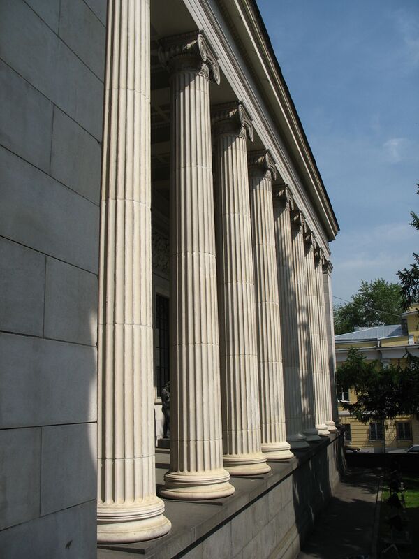 Здание было построено в неоклассическом стиле в виде античного храма с высоким подиумом и ионической колоннадой по периметру фасада и стало последним в Москве строением, возведённым с неогреческими элементами. Колоннада в увеличенном масштабе воспроизводит пропорции восточного портика Эрехтейона — храма в афинском Акрополе[10].