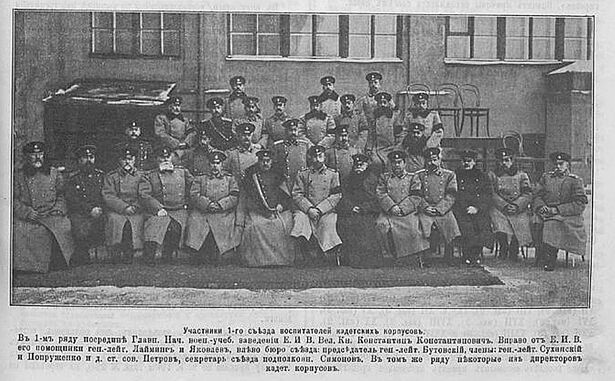 Участники Первого съезда офицеров-воспитателей кадетских корпусов. Первый ряд: А.И. Калишевский, Н.А. Хамин, Е.Е. Семашкевич, П.Н. Лазарев-Станищев, В.В. Римский-Корсаков, В. Э. Данкварт, В.А. Шильдер, Л.П. Войшин-Мурдас-Жилинский, Н.А. Радкевич, В.В. Григоров, Н. П. Попов, В.М. Кох. Второй ряд: Н.А. Зотов, М.Л. Салатко-Петрище, Н.Д. Казанцев, К.П. Сангайло В.В. Цытович, М.А. Трубников, В. И. Греков, А.В. Полторацкий, Г.Ф. Гирс, А.Н. Зауервейд, Е.И. Глотов, А.Ф Вячеслов, И.И. Рыковский, Н.К. Михайловский, В.Д. Языков, А.Л. Вильке, Д.А. Агищев, Н.Н. Бахтин, А.Н. Антонов, Е.А. Заржецкий. Третий ряд: М.А. Угрюмов, Н.Г. Лукирский, В.В. Гаврилович, Ф.В. Гринев, Б.А. Вильбоа, В.П. Дзякович, И.А. Завадский, Г.Д. Дитерихс, М.И. Мягков, В.И. Попов-Азотов, Н.Л. Хитрин, В.О. Плошинский, А.С. Азарьев, Н.Д. Коптев, В.А. Муромцев, Ф.Н. Доннер, В.В. Смирнов, А.Д. Ромашкевич, Н.Н. Купчинский, М.А. Сафонов. Четвёртый ряд: К.К. Лютер, Н.С. Желязовский, В.С. Лавров, Б.А. Гартвиг, А.С. Манучаров, В.И. Бурков, Т.В. Львов, П.П. Шаховской, В.С. Яковлев, В.Д. Чемякин, П.П. Черепанов, И.Г. Денисов, В.В. Татаринов, Н.В. Петров. Санкт-Петербург. 1908 год