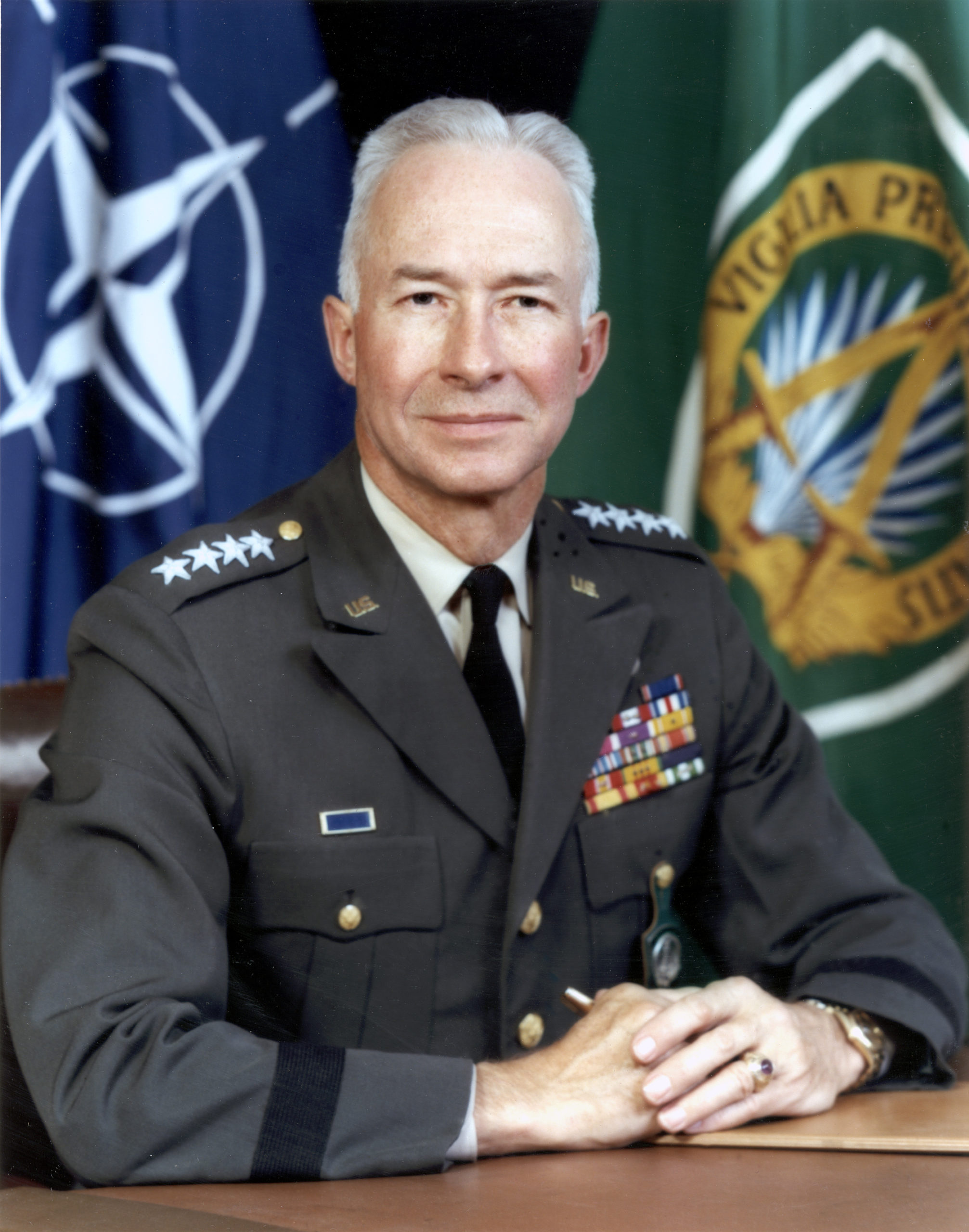 26 июня 1987 года Главнокомандующим стал Джон Гэлвин, назначенный Рейганом[43][44]. До падения Берлинской стены, в 1989 году в Германии начали рассматривать возможность сокращения численности вооружённых сил на 22 процента, а в Канаде — вопрос о выводе подразделений из Европы, вследствие чего Гэлвин отметил, что из-за этих односторонних намерений альянс потерял около 10 процентов военного потенциала[45], в которые вошли ликвидация 50 американских баз и сокращение количества военнослужащих, инициированные в 1990 году новоизбранным президентом Джорджем Бушем-младшим[46][47]. В 1990 году премьер-министр Италии Джулио Андреотти рассказал о том, что НАТО с 1956 года стоит за финансированием и вооружением членов антикоммунистических организации в рамках операции «Гладио» для противодействия возможному вторжению СССР и его союзников по Варшавскому договору в Европу[48], однако со стороны официальных лиц НАТО и самого Гэлвина никакой реакции не последовало[49]. Внеся свой вклад в окончание холодной войны, в 1992 году Гэлвин ушёл с должности и с военной службы[50][51].