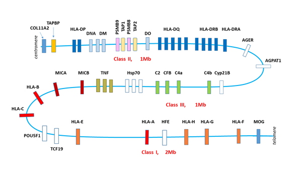 Локус HLA содержит также гены трех цитокинов семейства фактора некроза опухоли, TNF, гены белков системы комплемента (С2, С4а, С4b, CFВ) и много других генов, чьи продукты не связаны напрямую с иммунной системой, например, CYP21P — один из цитохромов Р450, POU5F1 и TCF19 — факторы транскрипции, AGER — регулятор многих клеточных процессов, Hsp70 и т. д.