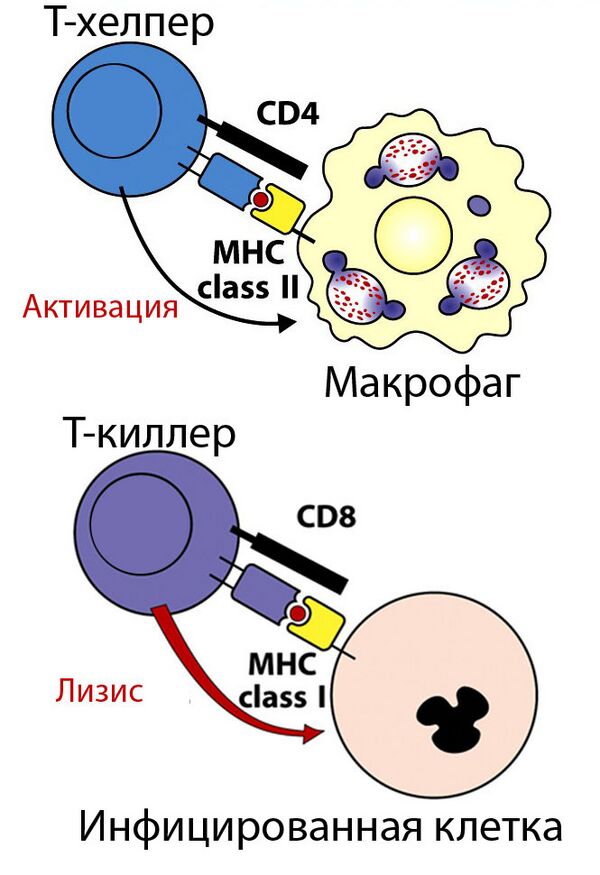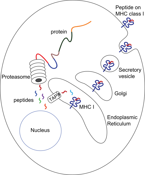 Два набора генов, класса I и II, кодирующие так называемые MHC класс I и MHC класс II молекулы, являются центральными игроками клеточного иммунитета. Основная функция МНС-I и МНС-II молекул — связывание пептидных фрагментов, полученных при внутриклеточном расщеплении белковых молекул, и презентация этих пептидов на поверхности клеток для распознавания Т- и NK- клеточными рецепторами. В большинстве своем это пептиды собственных белков, если же в организм попал патоген, то на поверхности клеток будут присутствовать и пептиды из чужих белков. Несмотря на то, что доля чужих пептидов на клеточной поверхности очень мала (одна молекула на десятки и сотни тысяч своих пептидов), такие зараженные клетки быстро распознаются Т-лимфоцитами и разрушаются иммунной системой. Презентация собственных белков на поверхности клеток чрезвычайно важна, иммунная система постоянно отслеживает и уничтожает не только инфицированные, но и поврежденные или измененные клетки[9][10].