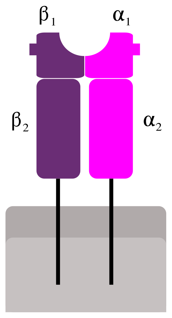 МНС-II молекулы имеют точно такую же доменную организацию, как и МНС-I, но их четыре домена расположены на двух полиморфных субъединицах примерно одинакового размера. Как α-, так и β-субъединицы имеют α1 (или β1) домен, образующий половину антиген-связывающего участка и иммуноглобулиновый домен α2 (β2), расположенный ближе к клеточной мембране[18]. Обе цепи имеют трансмембранную спираль и короткий цитоплазматический конец в 12-18 аминокислот. Трехмерная структура внеклеточных частей МНС обоих классов очень похожа, пептид также связывается в желобе между двумя спиралями. Основное отличие состоит в том, что спирали, образующие стенки антиген-связывающего желоба МНС-II, не подходят близко друг к другу, и желоб оказывается открыт с обоих концов. По этой причине, ни N-, ни C-концы пептида не принимают особого участия в связывании с МНС-II, более того, часто наблюдают, что они свешиваются наружу[19], что хорошо коррелирует с тем фактом, что антигены МНС-II гораздо длиннее, чем у МНС-I.