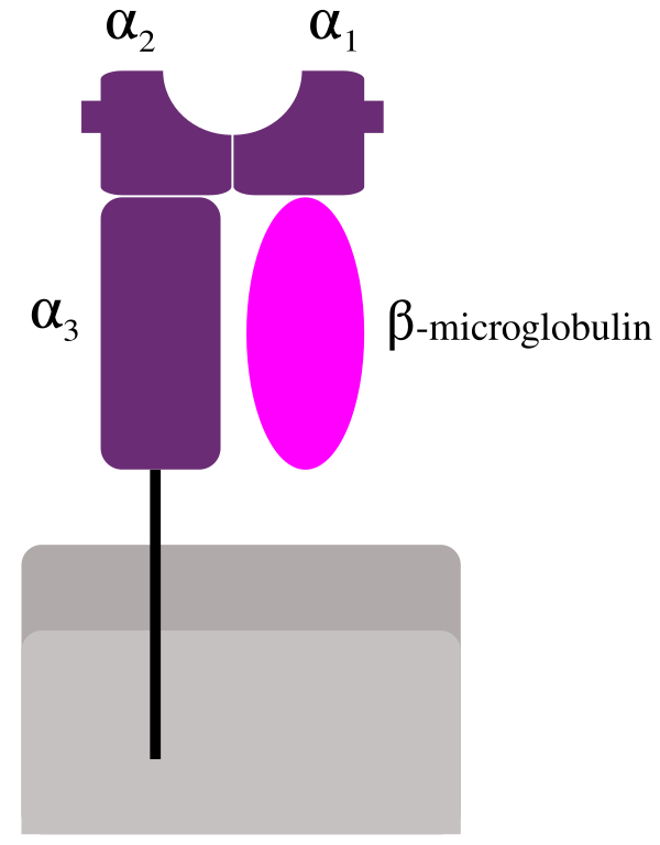 Белковая молекула МНС-I — гетеродимер, состоящий из инвариантной малой субъединицы, называемой β2-микроглобулин, и тяжелой полиморфной α-субъединицы, кодируемой одним из генов класса I локуса МНС (у человека — HLA-A, HLA-B или HLA-C). α-цепь МНС-I содержит 365 аминокислот. 284 N-концевых остатка образуют экстра-клеточную часть молекулы, следующая за ними трансмембранная спираль удерживают МНС-I на поверхности клетки, а последние 32 аминокислоты, расположенные в цитозоле, отвечают за внутриклеточный транспорт МНС-I из эндоплазматического ретикулума на поверхность[15] . Кристаллографический анализ показал, что внеклeточная область α-цепи МНС-I делится на три домена α1, α2 и α3, каждый по 90 аминокислот. α1 и α2 домены образуют антиген-связывающую часть МНС-I[5]. Антигеном для МНС-I являются пептиды длиной 8-10 аминокислот. α3 домен имеет иммуноглобулиновую укладку, такую же как соседний β2-микроглобулин, эти два иммуноглобулиновых домена отделяют пептид-связывающую область от клеточной мембраны. α1 и α2 домены имеют одинаковую третичную структуру из четырех антипараллельных β-стрендов и длинной α-спирали, лежащей сверху. Вся α1 — α2 конструкция напоминает плоскодонку, дно которой образовано восемью β-стрендами, а борта α-спиралями. Внутри этой плоскодонки размещается пептид, напоминая команду гребцов из 8-10 участников. Пептид имеет протяженную конформацию, так что в отличие от команды гребцов, боковые цепи соседних аминокислот будут направлены в разные стороны. Часть из них будет направлена вниз, связываясь в карманах дна пептидо-связывающего желоба МНС-I. Разные МНС-I имеют разные карманы, определяя пептидную специфичность каждого аллеля[16]. Например, HLA-A2 имеет небольшие гидрофобные карманы для остатков 2 и 9, и положительно-заряженный карман для остатка 4, поэтому HLA-A2 связывает пептиды, имеющие Leu/Met в положении 2, Asp/Glu в положении 4 и Val/Leu в положении 9. А вот аллель HLA-B27 связывает пептиды с Arg на втором месте, Phe/Trp/Tyr на третьем и Leu/Phe на девятом. Посмотреть мотивы пептидов для разных аллелей можно на сервере MHCMotifViewer. Остатки пептида, смотрящие вверх, будут взаимодействовать с Т-клеточным рецептором, как и несколько остатков самой МНС, опреляя двойную специфичность этого рецептора, патогенного пептида и данного аллеля МНС хозяина.