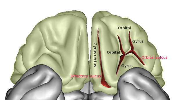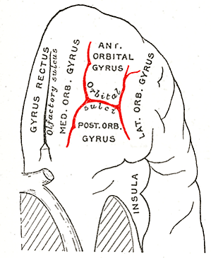 Кнаружи от обонятельной борозды нижняя поверхность лобной доли покрыта изменчивыми по своей форме бороздками, которые чаще всего образуют сочетание в виде буквы «Н» и обозначаются как глазничные (или орбитальные) борозды. Поперечную борозду, обычно образующую перекладину буквы «Н», некоторые авторы называют поперечной глазничной (орбитальной) бороздой (лат. sulcus orbitalis transversus), а отходящие от нее продольные бороздки — латеральной и медиальной глазничными (орбитальными) бороздами (лат. sulci orbitales lateralis et medialis). Между глазничными бороздами располагаются четыре глазничные извилины[1][2].