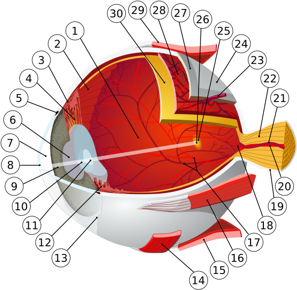 Глаз, или орган зрения, состоит из глазного яблока, зрительного нерва. Отдельно существуют вспомогательные органы (веки, слёзный аппарат, мышцы глазного яблока).
