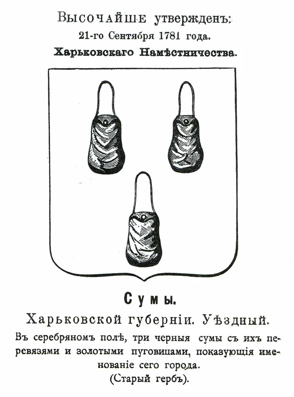 - Изюм (1775, 1781) — три грозди изюма (красного винограда). В современном гербе города 1990-х виноград уже зелёный.