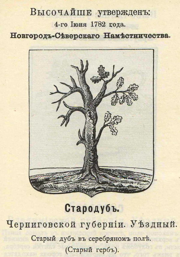 - Стародуб (1730, 1781) — «дуб старой, стоящий на зелёной земле, поле белое» 1730.