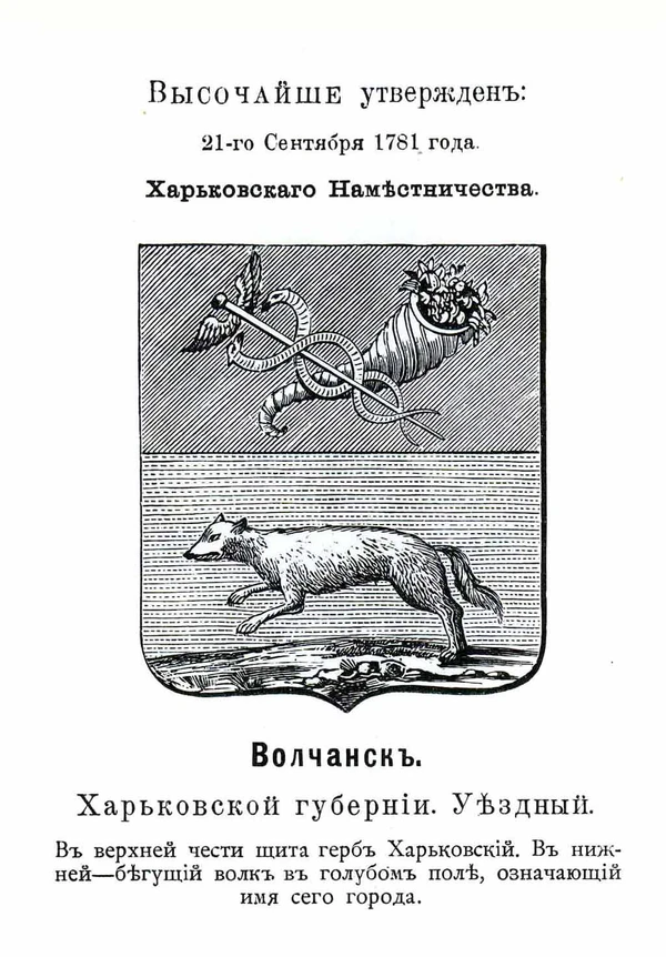 - Волчанск (1781) — бегущий волк.