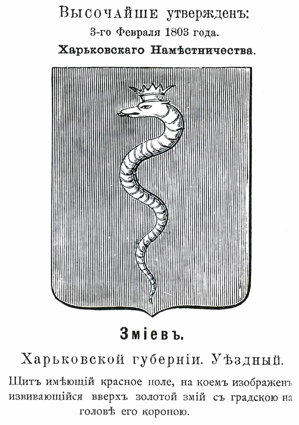 - Зми́ев (1803) — «извивающийся вверх золотой змий с градскою на голове его короною».