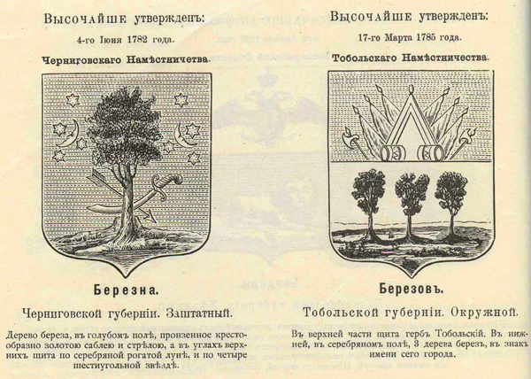- Берёзов (1785) — «в серебряном поле три дерева берез, в знак имени сего города».