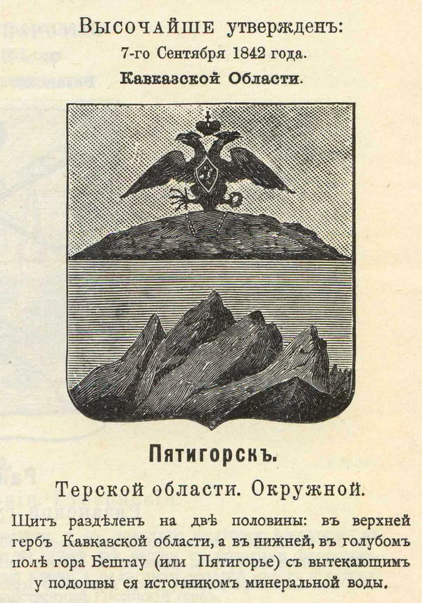 - Кавказская область — Кавказские горы, скачущий кавказец, разорванная цепь Прометея [прикованного на вершине Кавказа] и русский орёл на вершине Казбека; герб назван СПб герольдией «самогласным».