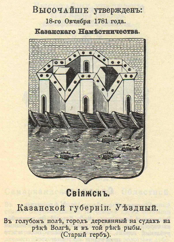 Оригинален герб Свияжска 1729 и 1781 годов (чисто исторический, но не гласный в прямом смысле) — «новый город деревянный на судах, на реке Волге, в ней рыба, поле лазоревое» 1730; «в голубом поле город деревянный на судах на реке Волге, и в той реке рыбы» 1781. Герб отражает тот факт, что Свияжск срубили в верховьях Волги, свезли вниз по течению в разобранном состоянии и собрали город как базу для штурма Казани.