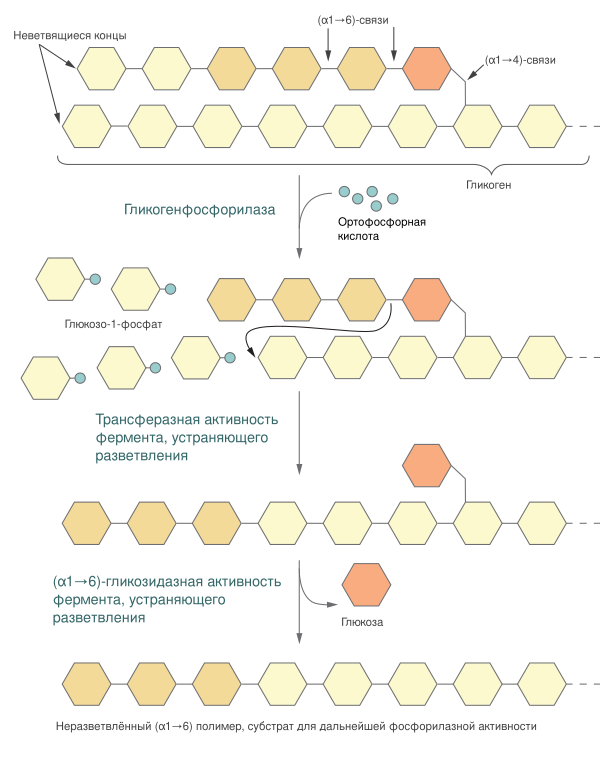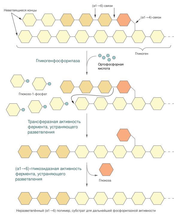 Гликоген, запасаемый в тканях животных, и крахмал, запасаемый растениями, могут быть мобилизованы клеткой для получения энергии при помощи гликогенолиза — фосфоролитической реакции, осуществляемой, прежде всего, ферментами гликогенфосфорилазой (или крахмалфосфорилазой у растений). Эти ферменты катализируют атаку неорганическим фосфатом (α1→4) гликозидной связи, соединяющей два крайних остатка глюкозы на неветвящемся конце, в результате чего образуется глюкозо-1-фосфат и глюкозный полимер, содержащий на 1 глюкозный остаток меньше исходного (к расщеплению (α1→6)-гликозидных связей они не способны). Часть энергии гликозидной связи при этом запасается эфирной связи, соединяющей фосфат с глюкозой в глюкозо-1-фосфате. Гликогенфосфорилаза (или крахмалфосфорилаза) продолжает отщеплять по одному глюкозному остатку до тех пор, пока она не дойдёт до последних четырёх глюкозных остатков на пути к точке ветвления полисахарида (т. е. гликозидной связи (α1→6)), где она останавливается. Далее в работу вступает олигосахарилтрансфераза, которая переносит три глюкозных остатка, ближних к концу неветвящегося участка, на нередуцирующий конец цепи и таким образом удлиняет её. Оставшийся глюкозный остаток, соединённый с основной неветвящейся цепью (α1→6)-гликозидной связью, отщепляется (α1→6)-гликозидазой в виде свободной глюкозы[4].