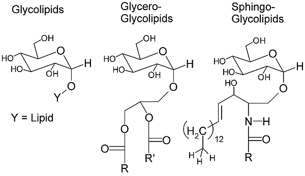 Главной формой гликолипидов в животных тканях являются гликосфинголипиды. Они содержат церамид, а также один или несколько остатков сахаров. Двумя простейшими соединениями этой группы являются галактозилцерамид (GalCer) и глюкозилцерамид (ClcCer). Галактозилцерамид — главный гликосфинголипид мозга и других нервных тканей, но в небольших количествах он встречается и во многих других тканях. Простые гликосфинголипиды в тканях, отличных от нервной, представлены главным образом глюкозилцерамидом; в небольших количествах он имеется и в ткани мозга.