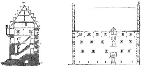 На первом этаже замка располагались пивоварня, пекарня, кухня, склад продуктов, винный погреб, а также колодец. Также на внизу был большой камин, с помощью которого горячим воздухом можно было зимой отапливать весь замок. Для этого в стенах заранее проложили особые воздуховоды. Большинство дымоходов ликвидировали в то время, когда здание начали использовать как зернохранилища. На верхних этажах были жилые комнаты владельца и членов его семьи, а также гостиная для приёма посетителей.