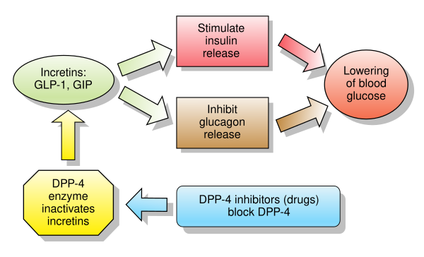 Механизм действия этих препаратов, вероятно, заключается в повышении уровня инкретина (GLP-1 и GIP) путем ингибирования их распада в печени. Инкретины ингибируют высвобождение глюкагона, снижают уровень глюкозы, увеличивают выделение инсулина и задерживают опорожнение желудка.