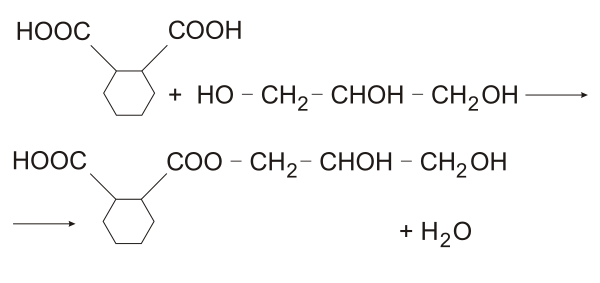 В начале процесса, вследствие этерификации гидроксильных групп глицерина возникают кислые моноэфиры, при этом кислотность смеси сильно снижается. Затем образуются диэфиры глицерина. В результате дальнейшей реакции конденсации, которая сопровождается выделением воды, образуются полимеры различного строения и разной молекулярной массы. Реакция образования кислых эфиров сопровождается выделением тепла без выделения воды, с большой скоростью. Конденсация кислых эфиров протекает медленнее и сопровождается превращением линейных молекул в разветвлённые и сшитые. Уменьшается кислотное число и число гидроксильных групп.[2]