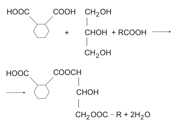 Начальная стадия проходит через моноглицерид с образованием кислого эфира, который может вступать в дальнейшую конденсацию с подобными соединениями или с молекулами основных компонентов. Образуются смолы с малой кислотностью и высокой эластичностью. При дальнейшем нагревании и за счёт двойных связей жирных кислот смолы могут преобразовываться в трёхмерный полимер. При увеличении жирности композиции происходит уменьшение скорости полимеризации, снижение твердости и повышение растворимости в нефтяных углеводородах.