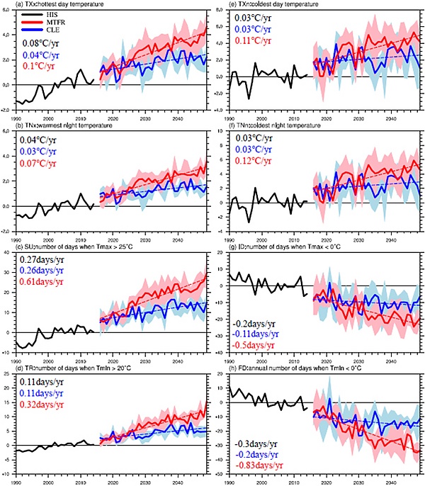 - ↑ Luo, Feifei; Wilcox, Laura; Dong, Buwen; Su, Qin; Chen, Wei; Dunstone, Nick; Li, Shuanglin; Gao, Yongqi (19 February 2020). “Projected near-term changes of temperature extremes in Europe and China under different aerosol emissions”. Environmental Research Letters. 15 (3): 4013. Bibcode:2020ERL....15c4013L. DOI:10.1088/1748-9326/ab6b34.