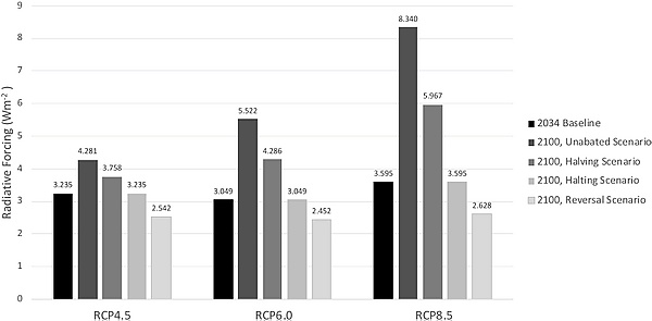 Независимо от текущей интенсивности аэрозольного охлаждения, во всех будущих сценариях изменения климата прогнозируется снижение концентрации твёрдых частиц, в том числе в сценариях, в которых достигаются целевые показатели в 1,5 °C и 2 °C: их конкретные цели по сокращению выбросов предполагают необходимость компенсировать снижение яркости. Поскольку, согласно моделям, охлаждение, вызванное сульфатами, в значительной степени эквивалентно потеплению, вызванному атмосферным метаном (а метан — это парниковый газ с относительно коротким сроком жизни), считается, что одновременное сокращение выбросов обоих газов эффективно компенсирует друг друга.[95] [96] Тем не менее в последние годы концентрация метана росла быстрее, чем в предыдущий период пикового роста в 1980-х годах,[97][98] при этом выбросы метана на заболоченных территориях во многом обусловили недавний рост,[99][100] в то время как загрязнение воздуха активно устраняется. Эти тенденции являются одними из основных причин, по которым в настоящее время ожидается потепление на 1,5 °C примерно к 2030 году, в отличие от оценок середины 2010-х годов, согласно которым это произойдёт не ранее 2040 года.