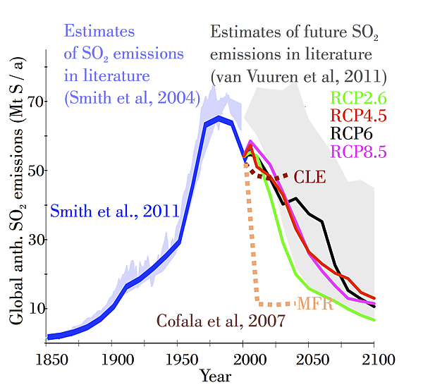 До промышленной революции основным источником сульфатных аэрозолей был диметилсульфид, вырабатываемый некоторыми видами океанического планктона. Вторым по величине источником были выбросы в результате вулканической активности, хотя крупные извержения вулканов, такие как извержение вулкана Пинатубо в 1991 году, происходят нечасто. В 1990 году в первом оценочном докладе МГЭИК было указано, что выбросы диметилсульфида составляют 40 миллионов тонн в год, а выбросы вулканов — 10 миллионов тонн. Эти годовые показатели в течение длительного времени оставались практически неизменными. С другой стороны, глобальные антропогенные выбросы серы в атмосферу увеличились с менее чем 3 миллионов тонн в год в 1860 году до 15 миллионов тонн в 1900 году, 40 миллионов тонн в 1940 году и около 80 миллионов тонн в 1980 году. Это означало, что к 1980 году антропогенные выбросы от сжигания серы-содержащего топлива (в основном угля и бункерного топлива) стали как минимум такими же большими, как все естественные выбросы серосодержащих соединений. В докладе также делается вывод о том, что «в промышленно развитых регионах Европы и Северной Америки антропогенные выбросы примерно в десять раз или даже больше превышают естественные выбросы».[40]