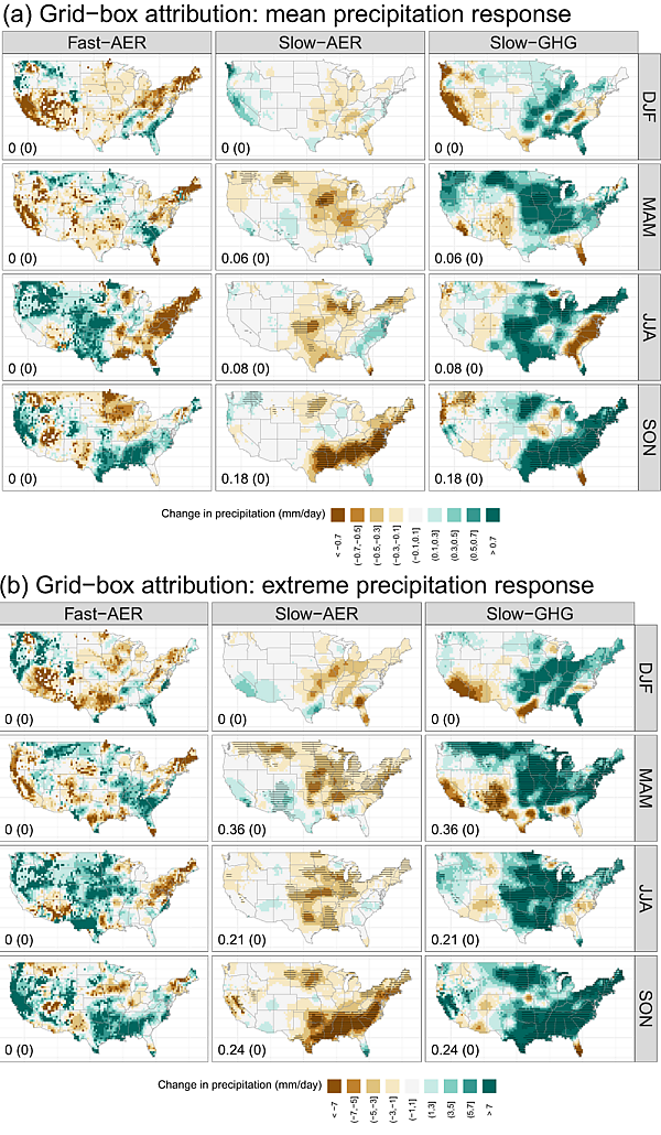 В 2009 году анализ данных за 50 лет показал, что небольшие дожди уменьшились над восточной частью Китая, хотя существенных изменений в количестве воды, удерживаемой атмосферой, не произошло. Это было связано с тем, что аэрозоли уменьшали размер капель внутри облаков, что приводило к тому, что эти облака дольше удерживали воду без дождя. Явление, при котором аэрозоли подавляют выпадение осадков за счёт уменьшения размера облачных капель, было подтверждено последующими исследованиями.[119] Более поздние исследования показали, что аэрозольное загрязнение над Южной и Восточной Азией не только препятствовало выпадению осадков, но и приводило к увеличению количества влаги, переносимой в Центральную Азию, где в результате увеличилось количество летних осадков. В Соединённых Штатах влияние изменения климата на круговорот воды обычно приводит к увеличению как среднего, так и экстремального количества осадков по всей стране, но до сих пор эти эффекты были «замаскированы» засухой, вызванной исторически высокими концентрациями аэрозолей. В Шестом оценочном докладе МГЭИК также была установлена связь между изменением концентрации аэрозолей и изменением количества осадков в Средиземноморском регионе.
