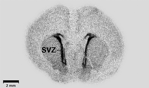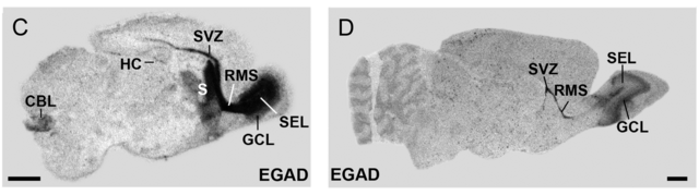 Экспрессия эмбриональных форм GAD67 в мозге крысы на 1-й день после рождения (слева) и на 90-й день (справа). SVZ - субвентрикулярная зона. RMS - ростральный миграционный тракт. CBL - мозжечок. GCL - слой гранулярных клеток. SEL - субэпендимный слой. HC - гиппокамп. S - стриатум. Часть изображения (авторадиограмма) из статьи Popp et al., 2009.[1]