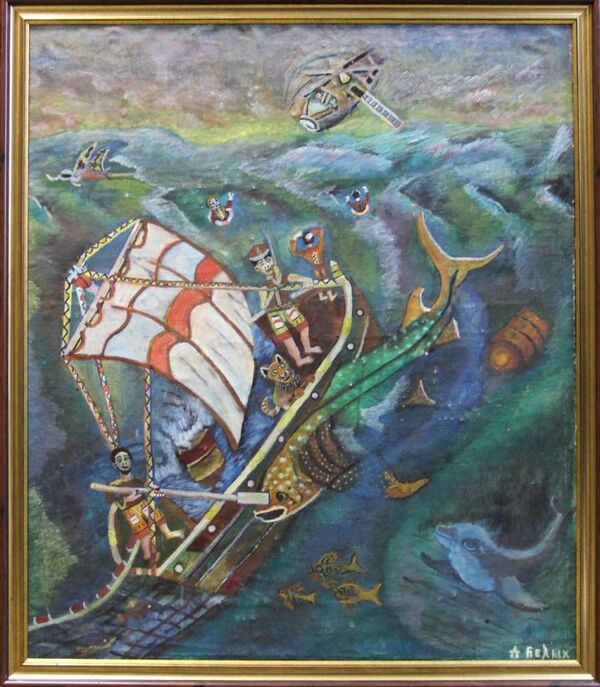 Центральное место в композиции занимает лодка под парусами, на которую нападает акула. В лодке находятся люди и собака. У верхнего края полотна изображена ещё одна лодка. В морской воде видны два человека, держащихся за спасательные круги. Картина относится к жанру марины и передаёт драматизм морской стихии.