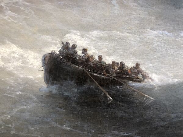 На переднем плане слева изображена лодка с людьми, спасающимися после кораблекрушения. Один из них показывает рукой в сторону берега, другие гребут и эта воля к жизни даёт надежду на спасение людей, не покорившихся стихии.