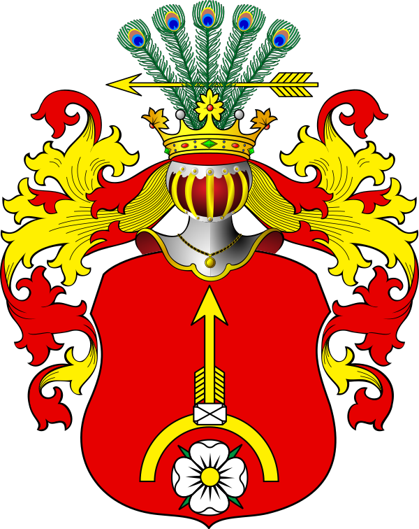 В красном поле золотая стрела, остриём вверх, на половине золотого же перстня, под которым белая роза.