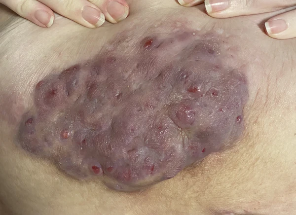 - Магнитно-резонансная томография мягких тканей — могут наблюдаться выраженное утолщение кожи, уплотнение тканей и формирование множественных абсцессов. Также возможна визуализация свищевых ходов[1].
