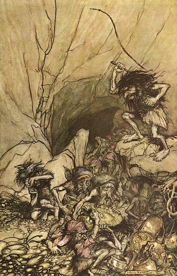 В древнегерманском эпосе «Песнь о Нибелунгах» подземные хранители сокровищ называются «нибелунгами». Два брата, короли нибелунгов, не могли поделить принадлежащий им клад. Они попросили героя Зигфрида организовать делёж, но остались им недовольны и обвинили витязя в своей сваре. Взбешённый Зигфрид сразил королей и стал владеть их кладом и страной нибелунгов. Карлик Альбрих, хранитель клада при прежних королях, стал служить Зигфриду.