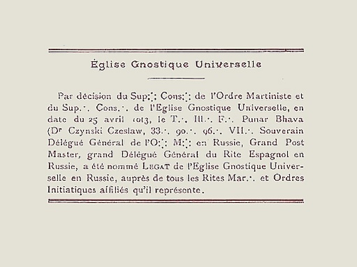 Так, Брико получает преемственность Дюанеля, сначала получив простую инвеституру в 1901 году, а затем пройдя церемониальное освящение и рукоположение в сан Папюсом в 1911 году. В 1912 году он вступает в общение с Патриархом Галликанской церкви по линии преемственности аббата Жулио, монсеньором Луи-Франуса Жиро (1876-1950), и получает от него рукоположение в сан пресвитера 21 июля 1912 года, а затем и хиротонию в епископы в епархии Ла-Мин-Сен-Аман 21-ого же июля, но следующего, 1913 года[26]. Таким образом, в отличие от Гностической Церкви Франции Дюанеля, Вселенская Гностическая Церковь получает с 1913 года подлинную епископскую преемственность[26].